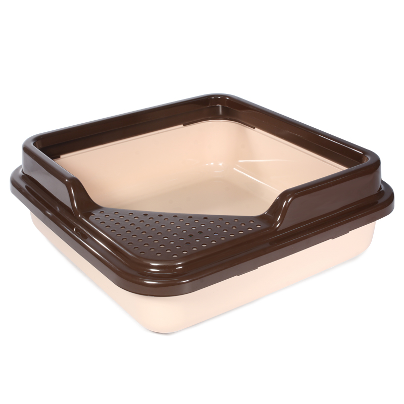 Пластиковый туалет для кошек квадратный с бортом - незаменимая вещь, если вы используете наполнитель. Благодаря высоким бортикам ваш пол останется чистым, а ваш питомец не будет ограничен в удовлетворении своих инстинктов. Дополнительным преимуществом является удобный угловой выход с защитной сеткой, предотвращающей высыпание содержимого лотка. Туалет изготовлен из износостойкого пластика, легко моется под струей воды и не впитывает запаха. Цвет поддона: капучино. Цвет борта: коричневый. Размер: 435*435*145мм.
