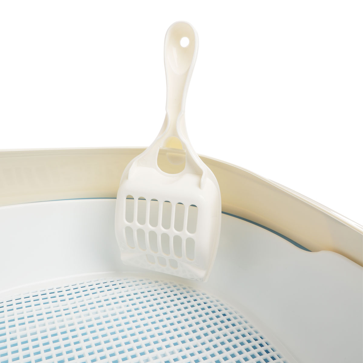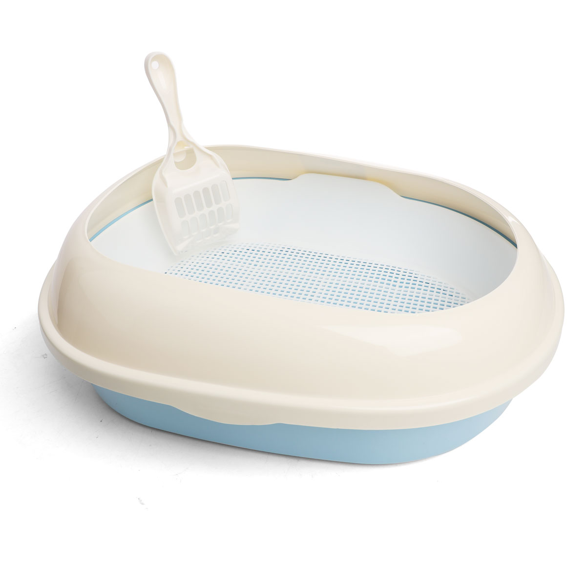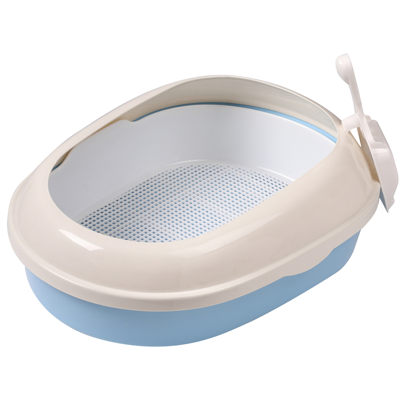 Туалет для кошек овальный с бортом, в комплекте с совком и сеткой. Очень удобный вариант, если вы еще не определили, что предпочитает ваша кошка. Лоток с сеткой идеально подходит питомцам, которые не любят наполнитель, но его необходимо мыть после каждого использования. А высокий борт - незаменимая вещь, если вы используете наполнитель. Благодаря высоким бортикам ваш пол останется чистым, а питомец не будет ограничен в удовлетворении своих инстинктов. Туалет изготовлен из износостойкого пластика, легко моется под струей воды и не впитывает запаха. Цвет поддона: голубой. Цвет борта: белый. Размер туалета: 500*370*170мм. Размер совка: 210*85*25мм.