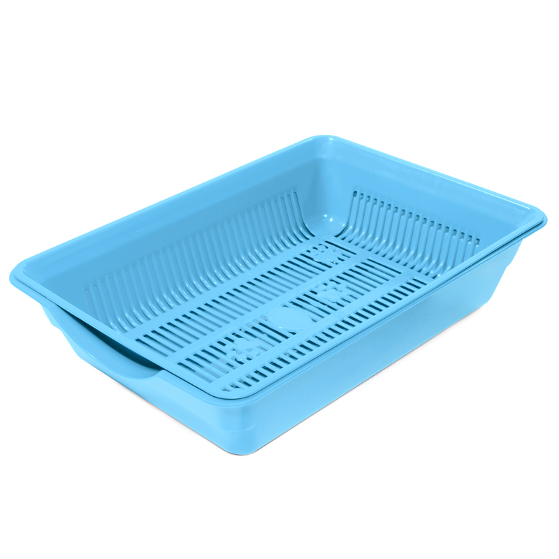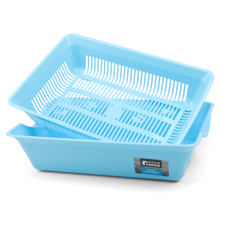 Туалет для кошек овальный с бортом, в комплекте с совком и сеткой. Очень удобный вариант, если вы еще не определили, что предпочитает ваша кошка. Лоток с сеткой идеально подходит питомцам, которые не любят наполнитель, но его необходимо мыть после каждого использования. А высокий борт - незаменимая вещь, если вы используете наполнитель. Благодаря высоким бортикам ваш пол останется чистым, а питомец не будет ограничен в удовлетворении своих инстинктов. Туалет изготовлен из износостойкого пластика, легко моется под струей воды и не впитывает запаха. Цвет поддона: голубой. Цвет борта: белый. Размер туалета: 500*370*170мм. Размер совка: 210*85*25мм.