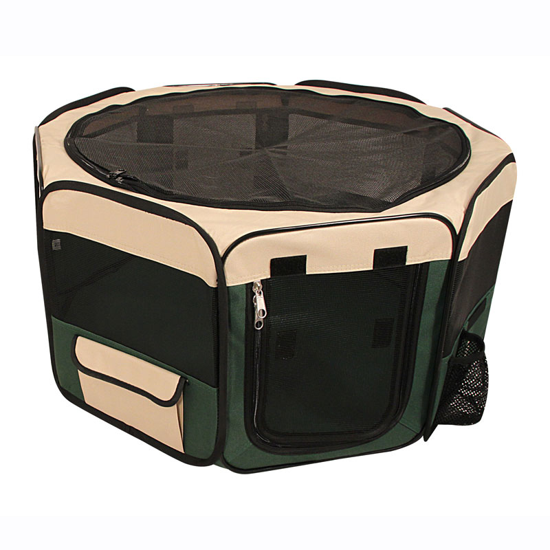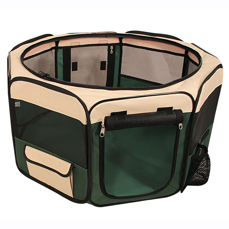 Удобный складной матерчатый вольер-тент - универсальное решение для владельцев собак. Его можно использовать как на улице, так и в помещении в качестве основного места для собаки. Незаменимым атрибутом дом-тент является для владельцев собак на выставках и при перевозке во время длительных путешествий. Дополнительная сетка (идет в комплекте) не дает возможности животному выбраться, а вшитая металлическая конструкция в разложенном виде крепко натягивает ткань, обеспечивая изделию максимальную устойчивость. Изделие имеет удобное отделение для поилки, съемная сетчатая крыша позволяет питомцу свободно дышать, а непромокаемое дно надежно фиксируется при помощи липучек и легко стирается в стиральной машине. Цвет: бежево-зеленый. Размер: 1390х1390х620мм