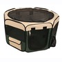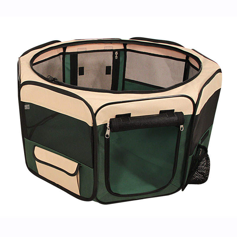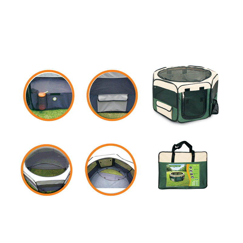 Удобный складной матерчатый вольер-тент - универсальное решение для владельцев собак. Его можно использовать как на улице, так и в помещении в качестве основного места для собаки. Незаменимым атрибутом дом-тент является для владельцев собак на выставках и при перевозке во время длительных путешествий. Дополнительная сетка (идет в комплекте) не дает возможности животному выбраться, а вшитая металлическая конструкция в разложенном виде крепко натягивает ткань, обеспечивая изделию максимальную устойчивость. Изделие имеет удобное отделение для поилки, съемная сетчатая крыша позволяет питомцу свободно дышать, а непромокаемое дно надежно фиксируется при помощи липучек и легко стирается в стиральной машине. Цвет: бежево-зеленый. Размер: 1390х1390х620мм