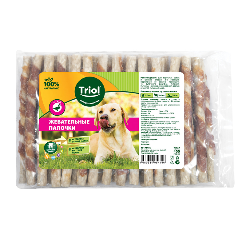 Жевательные палочки с уткой для собак - это полезное угощение для профилактики зубного камня, тренировки челюстных мышц и укрепления структуры костных тканей. Входящее в состав мясо утки способствует повышению иммунитета и укреплению сердечно-сосудистой системы. Лакомство рекомендовано для взрослых собак и щенков старше трех месяцев. Масса нетто: 400г.