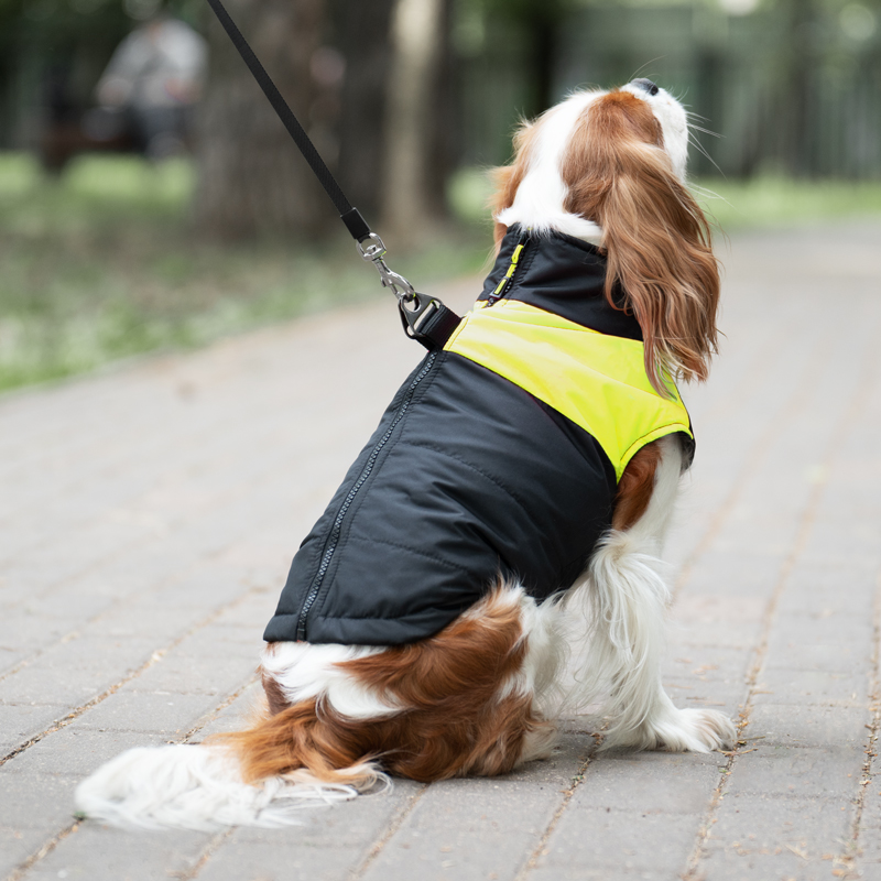 Удобный и функциональный жилет "Неон" выполнен из водоотталкивающей и ветронепроницаемой ткани, которая защитит питомца от холода и грязи. Застежка-молния на спине максимально облегчает одевание питомца, а два кольца для крепления поводка позволяют обойтись без дополнительной амуниции. Контрастная расцветка изделия сделает собаку яркой и заметной на улицах города. Размер: длина спины 340 мм, обхват груди 450 мм. Цвет: чёрно-желтый.